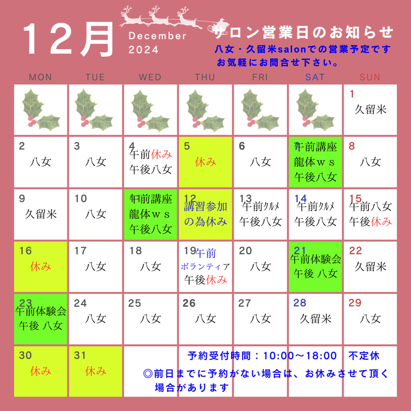 12月の八女、久留米salonでの営業日程をお知らせ致します。