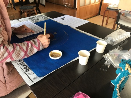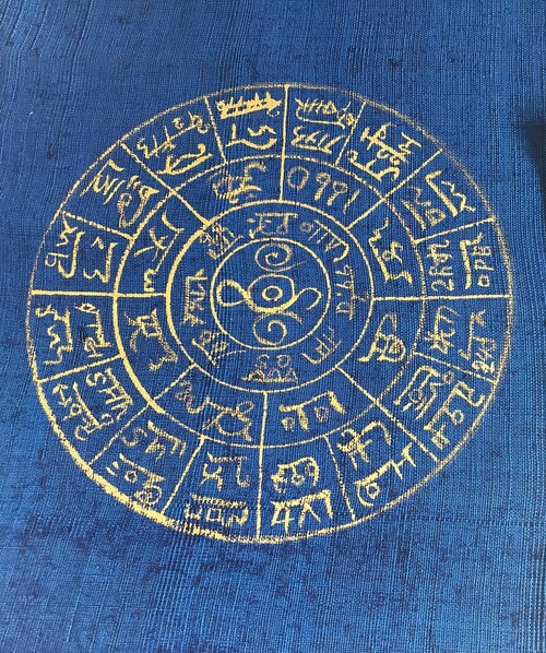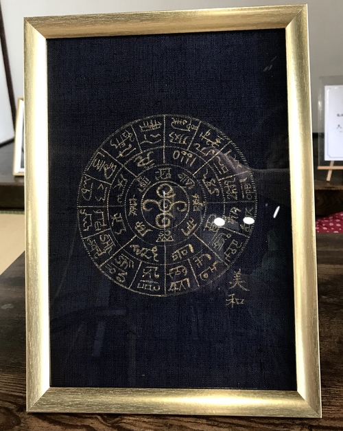 作品はフトマニ図月の満ち欠け 麻布はインディゴ
