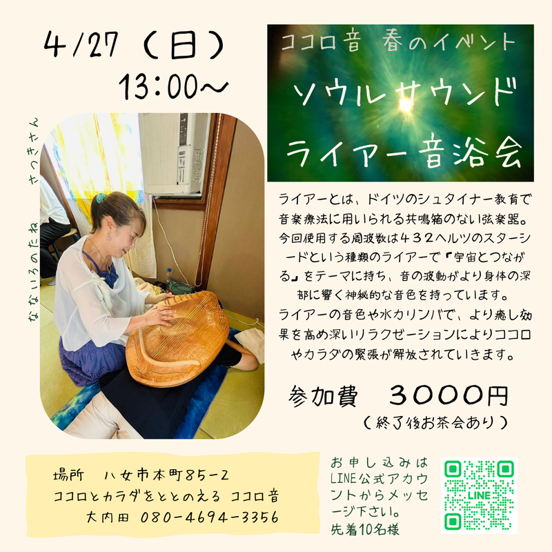 今回のイベントは、″なないろのたねの さつきさん” をお招きしてソウルサウンドライアー音浴会を開催いたします。