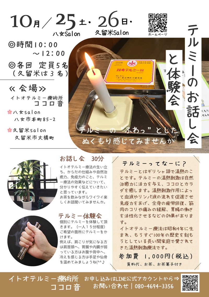 今年の夏はあまりにも暑く、自分の体調管理も難しくてお話会&体験会をお休みしていましたが、少しづつ秋めいてきましたので、イトオテルミー療法を沢山の方に知って頂きたく下記の日程で”テルミーのお話会と体験会”を開催致します。